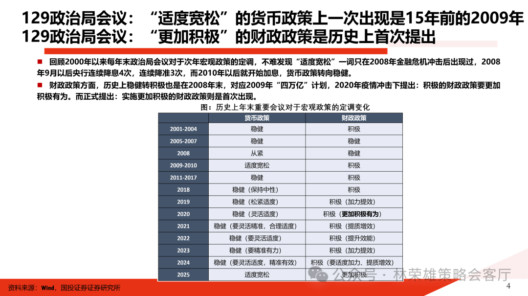 炒股就看金麒麟分析师研报,泰斗,专科,实时开云kaiyun中国官方网站,全面,助您挖掘后劲主题机会! 起原:林荣雄(金麒麟分析师)策略会客厅 中枢不雅点 2024年12月9日政事局会议厚爱召开。对比近三年年末与前三次政事局会议通稿本质来看,本次会议有几个进攻不雅察: 1、初次提倡“愈加积极”的财政政策:中枢对应的是提高财政赤字率,历史上财政政策郑重转积极出目下2008年末,对应2009年“四万亿”假想,此外2020年疫情冲击下提倡积极的财政政策要愈加积极有为。 2、“适度宽松”的货币政策,较此前郑重格调有明显转向:“适度宽松”一词只在2008年末金融危境冲击后出现过,对应2008年9月以后央行蛊卦降息4次,蛊卦降准3次,而2010年以后就驱动加息,货币政策转向郑重。 3、首提加强“超旧例”逆周期诊治,首提“稳住楼市股市”,扩大内需此次依然摆在紧要位置。 不错说通稿全文是这是近几年本质最丰富、表态最积极的一次,也预示着行将召开的中央经济责任会议会在政策层面给出更多的积极信号。固然后续具体门径和大宗细节要留待中央经济责任会议明确,但不错看到咱们正在试图在新一轮中好意思政策博弈中占据一定策略主动,这亦然咱们年度策略会上《大棋局:后发制东谈主》中期待看到的“后发制东谈主”。 从A股订价的角度,面临来岁外围环境风高浪急所变成的压力,“稳中求进”大基调很进攻:“稳”股市、稳“楼市”、稳“外贸”,对应愈加积极的财政政策和适度宽松的货币政策。更为要害的是:本次会议积极定调意味着一朝经济基本面劣势状态较为明显以及外部冲击较大,逆周期诊治的力度将会告别小步快跑、边走边看的传统政策逻辑,中枢在于关爱【超旧例】逆周期诊治的时辰节拍,这对A股大致是来岁输赢手问题。 在此,咱们转头2000年以来每年末政事局会议关于次年宏不雅政策的定调,不难发现:宏不雅政策积极转向齐对阛阓存在显耀正面影响,同期无论政策的握手是什么地方,在政策定调转向之后成长格调会最初受到风险偏好抬升的影响呈现相对跑赢的。 1、从2008年财政货币政策同期转向的训戒来看,短期阛阓呈现出结构分化的特征,政策定调转向的后一个月,上证指数连接下降3.46%,但对风险偏好明锐的成长格斡旋小盘股则仍是驱动上升。政策定调转向后三个月,上证指数上升8.6%,成长格调领涨,其次是受益于财政刺激政策的上游顺周期品种,如有色、建材等。 2、从2020年财政提倡“愈加积极有为”之后的训戒来看,短期阛阓依旧反应粗犷,政策定调转向的后一个月,上证指数小幅上升1.83%,但对风险偏好明锐的成长格斡旋受益疫后复苏的破钞格调则仍是驱动上升。政策定调转向后三个月,上证指数上升7.76%,成长格调领涨,其次是受益于财政促进破钞和疫后需求复苏的大破钞限制,如医好意思、社服、食物饮料等。 蛊卦近期十年期国债利率破2%后进一步下行,阛阓猛烈者自9月底以来已感受到国内货币政策策略宽松周期已开启;同期,关于A股资金入场闸门,监管层明确迎接“短期投资、长久投资”并承诺买通“长久资金入市的堵点”,不丢丑出基于“流动性”视角鼓励股市进取的策略身分已完备,而短期基于流动性使得阛阓冲破颤动状态,那时刻性疑窦在强弱好意思元问题,跨年大行情咱们要恭候的是好意思元由强转弱的机会。基于“基本面”视角的行情,则是要关爱蛊卦两个月以上M1回升。转头历史看,在M1自底部出现蛊卦两个月以上回升后破钞暖和周期板块为代表大盘限制就会伸开订价,届时大致会变成面向基本面订价的格调切换。 总结而言:跨年有莫得格调切换看M1,跨年是不是大行情看好意思元是否由强转弱。 站在现时,要明确924行情以来阛阓振荡波动主若是因为心绪。现时国内问题中枢是刺激与转换的干系,对应刺激更多是带来基于风险偏好的波段订价,刺激+转换能力扭转资产价钱预期,带来基于基本面的赓续订价。结构上,现时订价的中枢矛盾依然是风险偏好,风险偏好弱订价高股息+中字头+市值措置,风险偏好进步订价科创50指数+中小盘成长+并购重组,而风险偏好转向基本面的订价大致要留待来岁二季度后期作进一步证实,这或与超旧例逆周期诊治有关。 风险辅导:政策不足预期,历史数据不预示改日