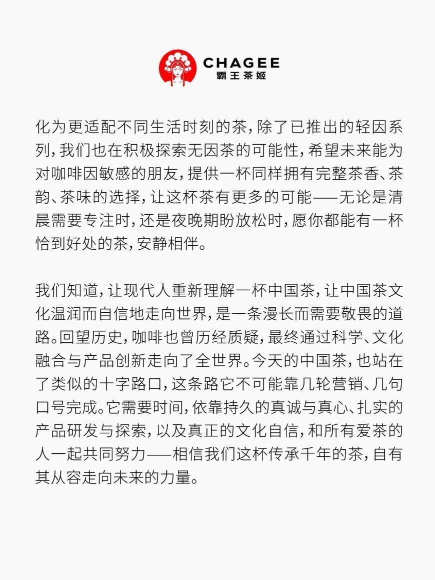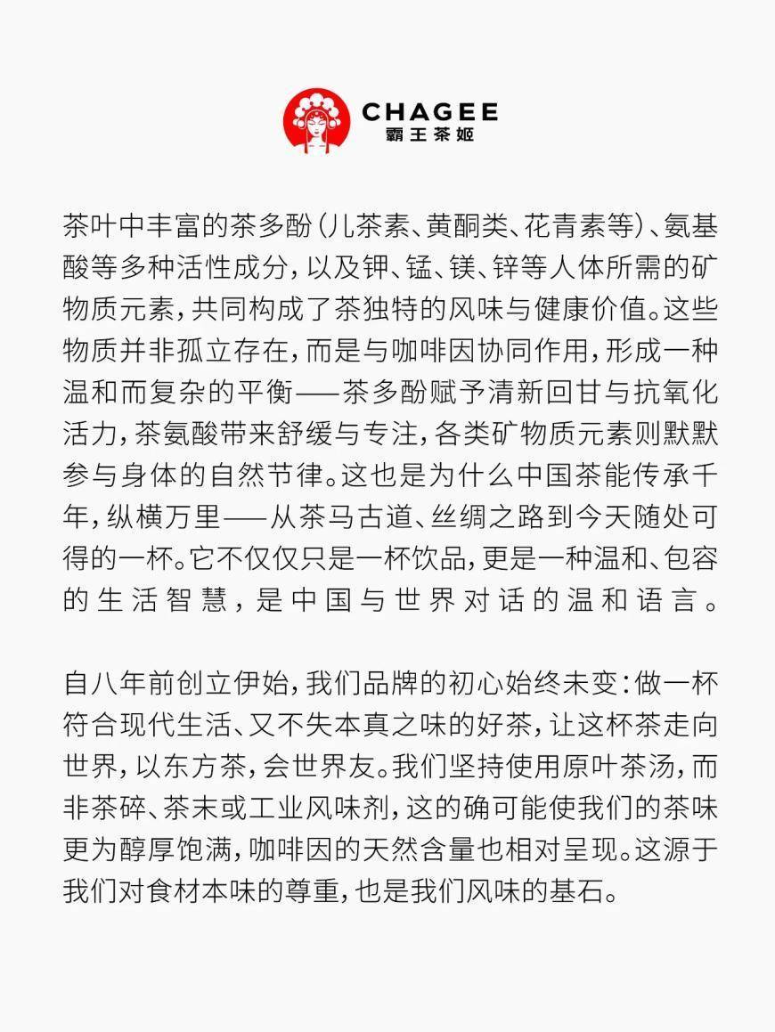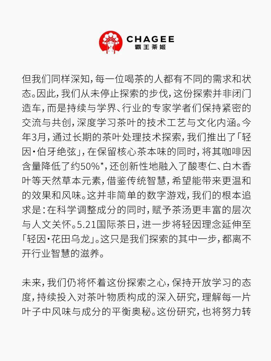 26日晚间,霸王茶姬发布长文回答质疑。公司在文中称,默契部分茶友们对咖啡因含量的热心,“依据现存的公开数据与检测效果,一杯遴荐原叶现泡的茶饮,其咖啡因含量按每100ml同等容量盘算,与一杯拿铁好像相配,并显赫低于一杯好意思式咖啡。” “更蹙迫的是,茶从来不啻有咖啡因。茶叶中丰富的茶多酚、氨基酸等多种活性身分,以及钾、锰、镁、锌等东谈主体所需的矿物资元素,共同组成了茶私有的仪态与健康价值。这些物资并非伶仃存在,而是与咖啡因协同作用,酿成一种讲理而复杂的均衡。”霸王茶姬暗示。